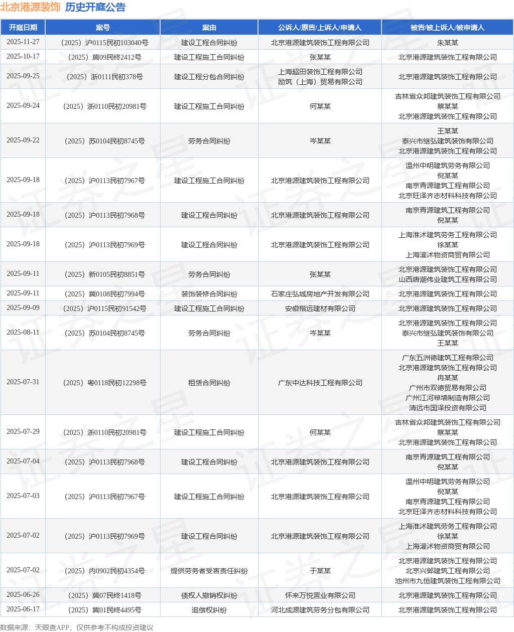 依据计算,近一年内以北京港源修建装修工程有限公司为当事人的前史开庭公告有90则,其间案由为“建造工程项目施工合同纠纷”的公告以22则居首,其次为“劳务合同纠纷”有16则,“建造工程合同纠纷”有12则。前史开庭公告(前20条)如下: