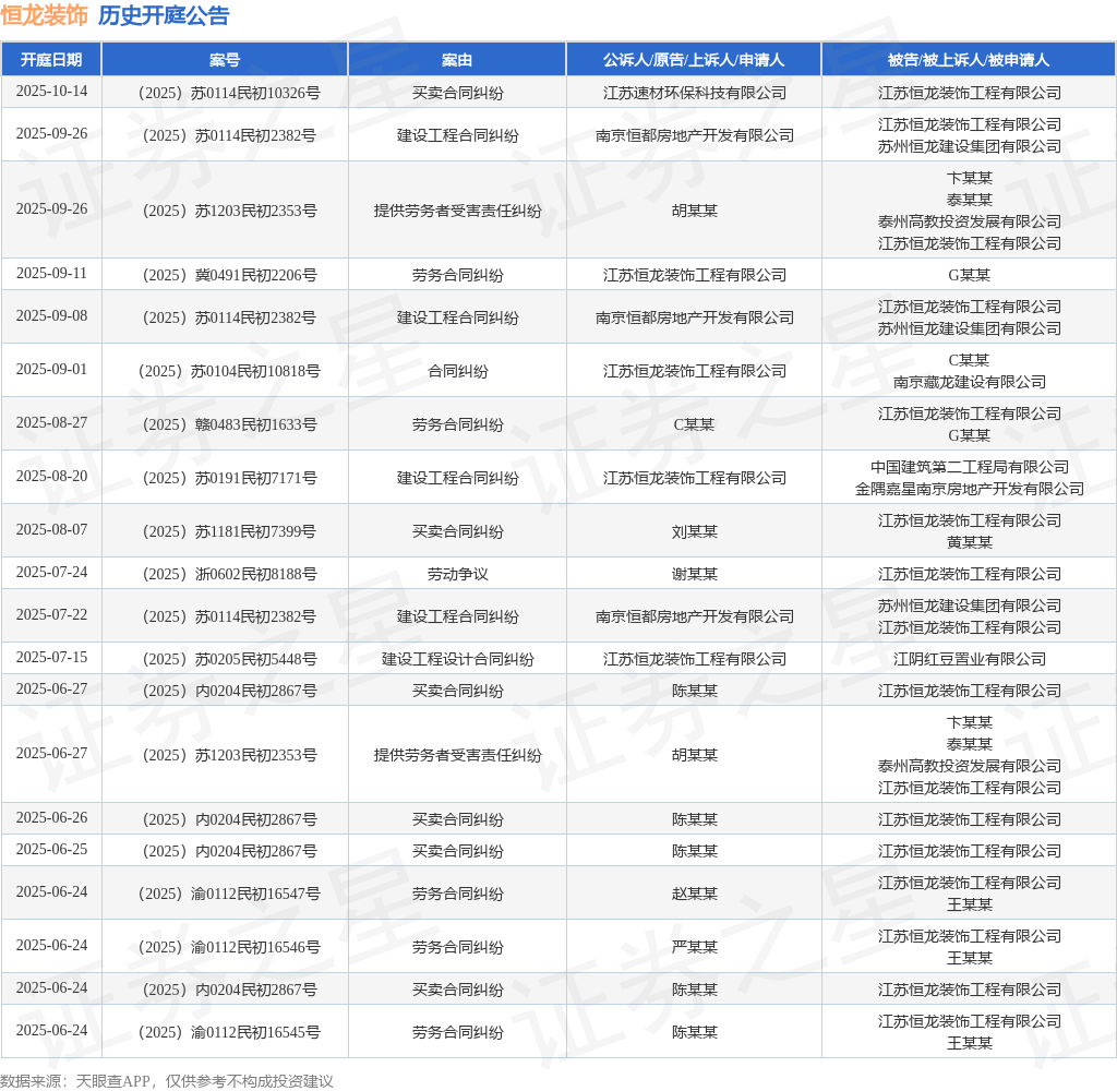 依据计算,近一年内以江苏恒龙装修工程有限公司为当事人的前史开庭公告有119则,其间案由为“建造工程项目施工合同胶葛”的公告以34则居首,其次为“生意合同胶葛”有33则,“劳务合同胶葛”有10则。前史开庭公告(前20条)如下: