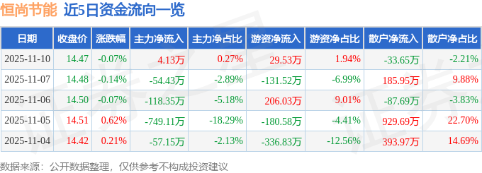证券之星音讯,到2025年11月10日收盘,恒尚节能(603137)报收于14.47元,跌落0.07%,换手率1.43%,成交量1.05万手,成交额1522.98万元。